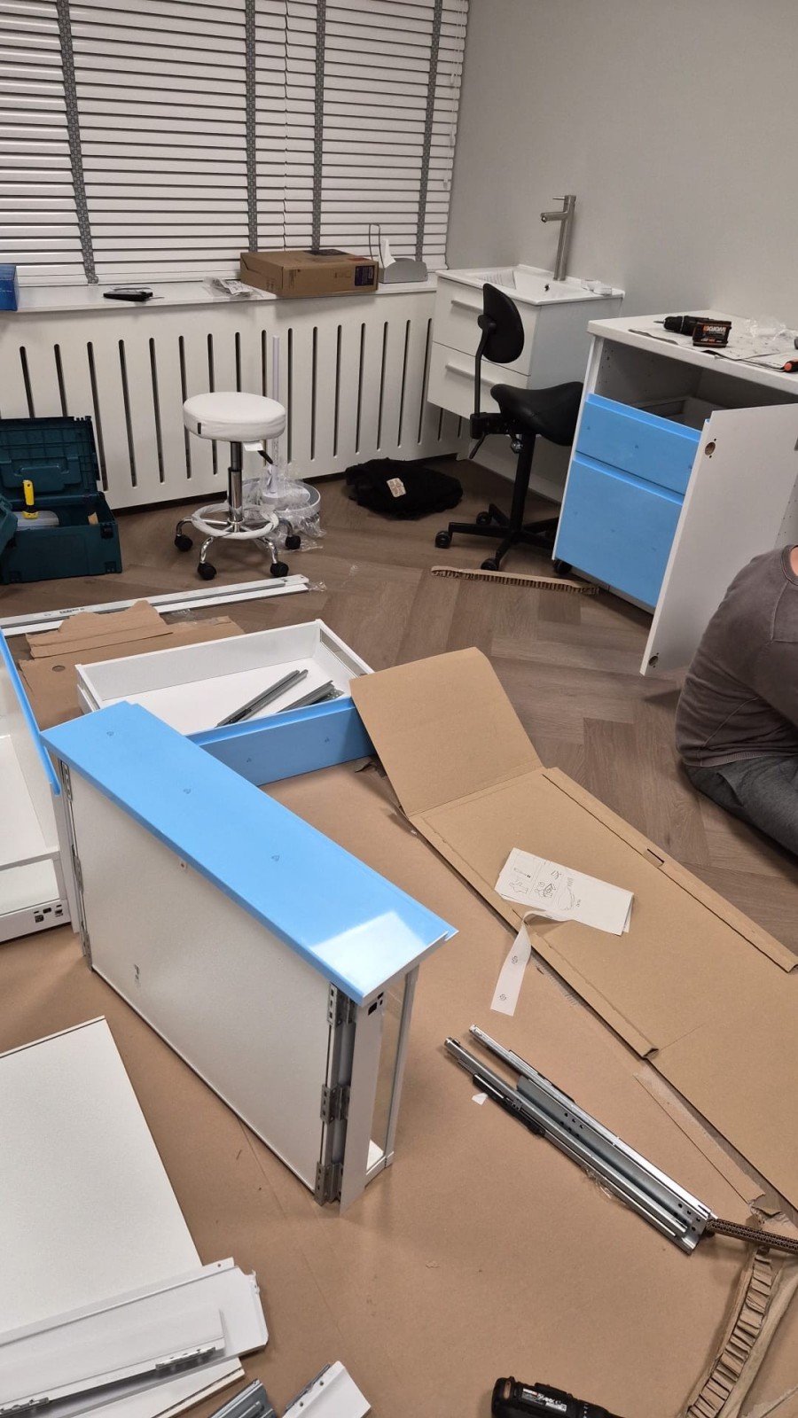 Tot in de late uurtjes hebben we gewerkt, meubels in elkaar zetten, alles aan muren monteren, spullen inruimen... Wat een werk! Gelukkig hebben we veel hulp gehad, want alleen hadden we het nooit gered. Op 5 januari zouden de banken overgezet worden naar de nieuwe locatie. Helaas was dat een beetje een tegenvaller omdat ze niet compleet geleverd waren. Ook de lasers hebben we deze dag overgebracht. Een ontlading toen die eindelijk op hun plek stonden! Het blijft superspannend om die zware en dure aparatuur te verplaatsen. Zeker gezien ze nu toch echt die trap op moesten. Maar als ze dan eindelijk op hun plek staan en je je beseft hoeveel ruimte er nu is om met deze apparatuur aan de slag te gaan dan is dat reden voor een feestje. Dat is even geviert met een kleine quickstep rond de behandelbank met de Diodelaser, haha!